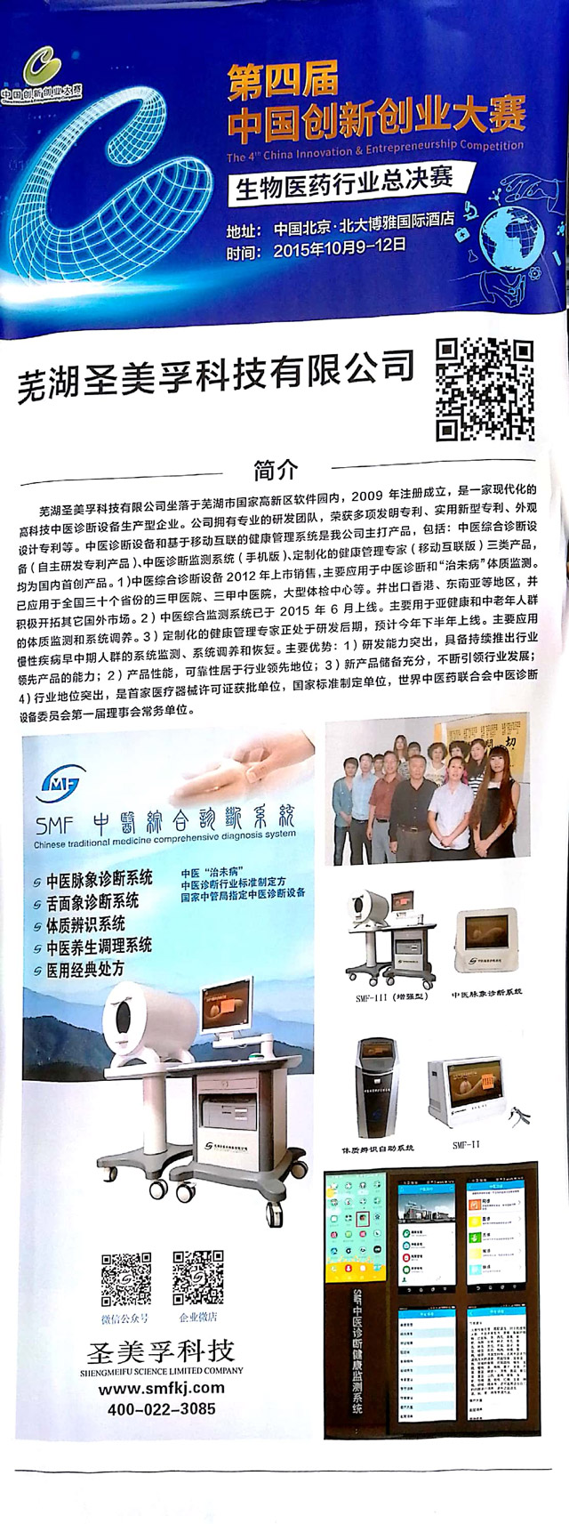 2015年,“中医脉象诊断系统”、“SMF中医舌面象仪”两项产品入选全国卫生产业管理协会首批“治未病服务适宜设备”;
